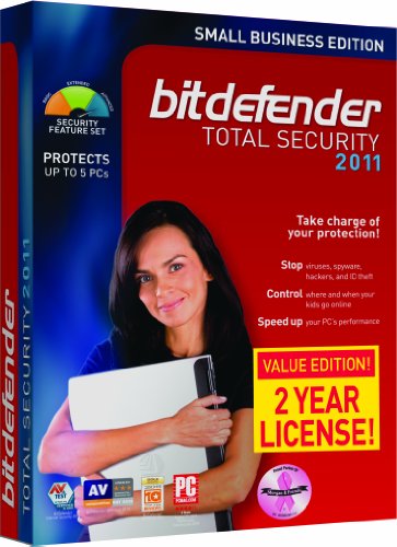 BitDefender Total Security 2011 Small Business Edition ? 5 PC/2 year Overview BitDefender Total Security 2011 gives 5 PCs two year of maximum protection against viruses, spyware, hackers, spam and other e-threats without slowing them down! Features: Firewall; iPhone-friendly Parental Controls, for monitoring and controlling wh    |